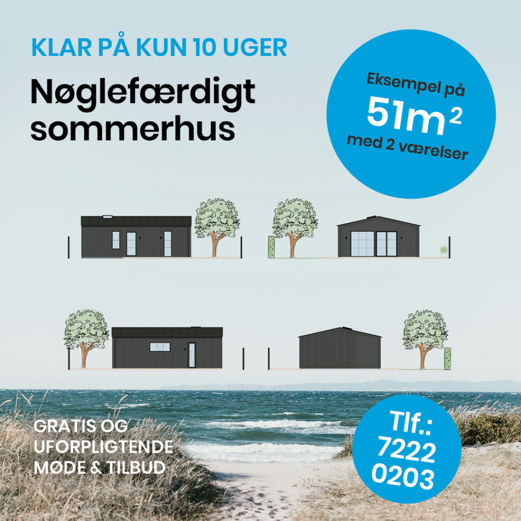 Hos os er du i trygge hænder – vi er specialister i at bygge sommerhuse og tilbyder både skræddersyede løsninger samt to nøglefærdige modeller på henholdsvis 51 m² (priser fra 1.275.000 ekskl. tilslutningsafgifter) og 76 m² (priser fra 1.650.000 ekskl. tilslutningsafgifter). Du får ikke bare et sommerhus – du får et gennemtænkt, æstetisk og funktionelt fristed på sommerhus, hvor hver kvadratmeter er maximalt udnyttet. Med to værelser og en gennemført planløsning skaber vi en rummelig og indbydende atmosfære. Vi tager hånd om hele processen, fra skitse og byggeansøgning til det færdige resultat.